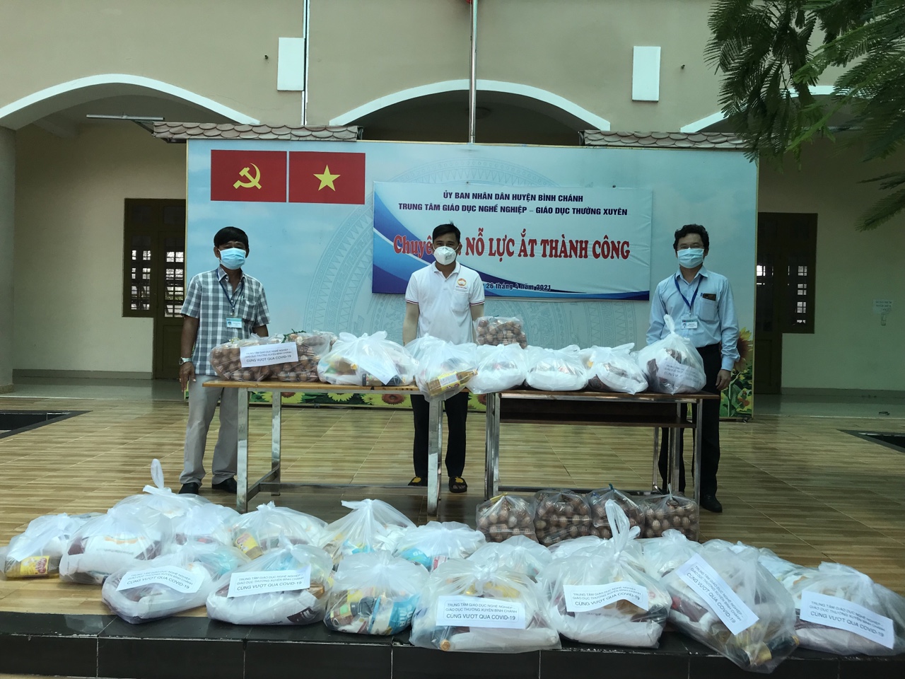Sáng ngày 18/8/21 Trung tâm GDNN-GDTX huyện Bình Chánh đã trao cho Ủy ban Mặt trận Tổ Quốc Việt Nam huyện Bình Chánh 30 phần quà (trị giá 400.000đ/1 phần) để hỗ trợ cho người dân bị ảnh hưởng bởi dịch covid- 19, các hộ dân các hoàn cảnh khó khăn. (Thực hiện theo Công văn số 312-CV/HU ngày 14/8/21).