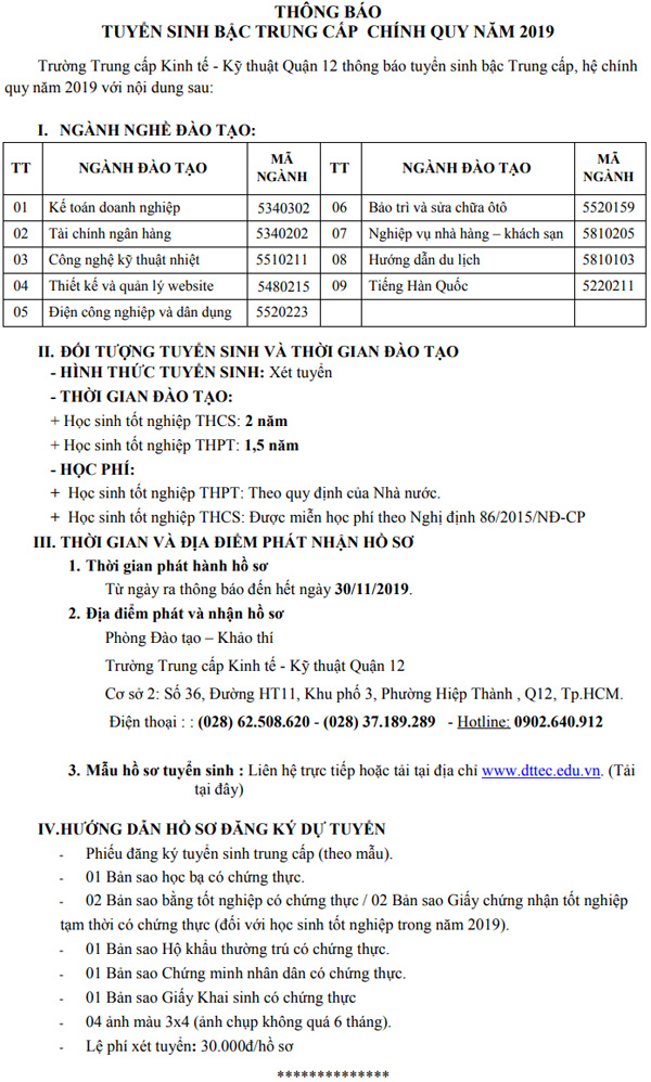 Thông báo tuyển sinh Trung cấp năm 2019 của Trường Trung cấp Kinh tế kỹ thuật Quận 12